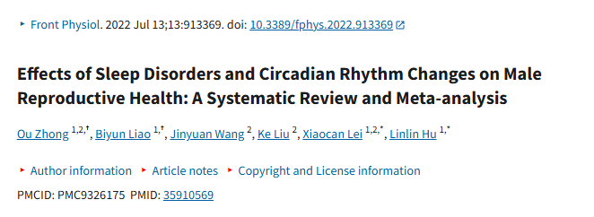 这项荟萃研究显示,睡眠障碍对男性的生殖健康有负面影响,与精子总数减少、精子浓度降低、前向运动率降低以及正常形态精子比例有相关关系。⑤