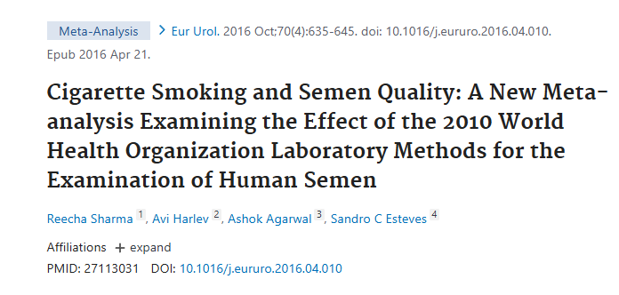 这项纳入5865名男性的荟萃分析表明,吸烟与精子数量和活力下降有关;而且,中毒至重度吸烟者的精液质量下降更为明显。⑨