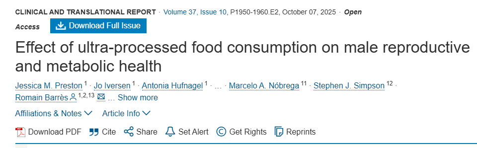 超加工食品(UPF),在cell的一项研究中,仅3周超加工饮食,不仅影响男性生育功能,还影响全身代谢:⑫