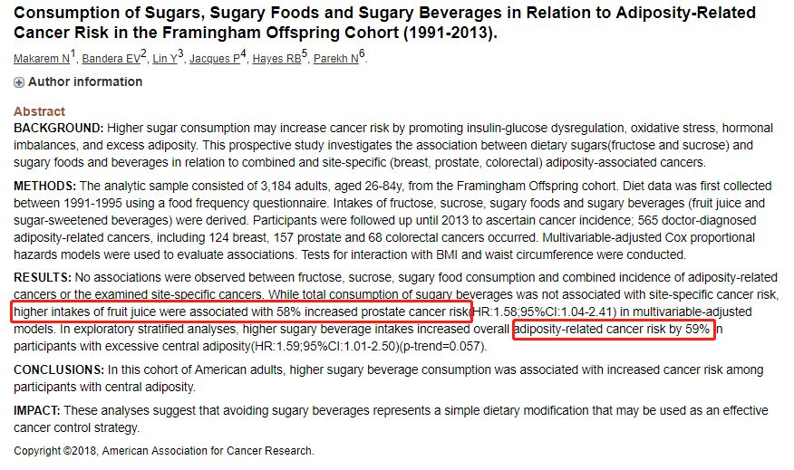 当然,这个研究只是说明了相关性,没有说明果汁,含糖和部分癌症的因果关系。