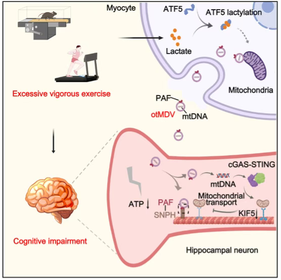 研究中的小鼠进行过度剧烈运动后,表面标记物PAF蛋白会抢先结合到神经元突触锚定线粒体的关键蛋白SNPH上,霸占停车位,导致正常线粒体无法停靠,突触能量供应中断。