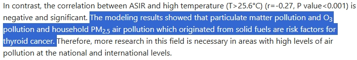 模型结果表明,源自固体燃料的颗粒物污染、臭氧污染和室内PM₂.₅污染是甲状腺癌的危险因素
