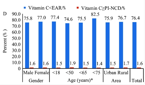 根据中国一项涵盖多省成人的研究的调查,成人群体中维生素C‘摄入不足’比例为约 76.4%。⑦
