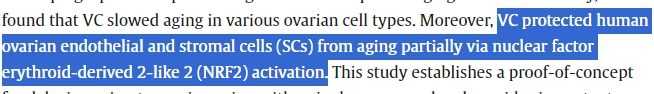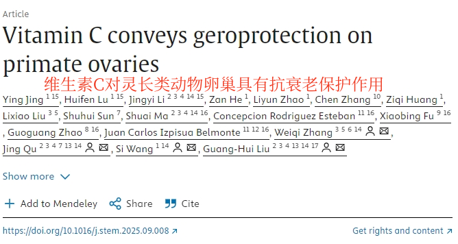 一开始《细胞·干细胞》的研究表明,维生素C的抗卵巢衰老作用部分通过经典的核因子红系2相关因子2(NRF2)抗氧化通路实现。
