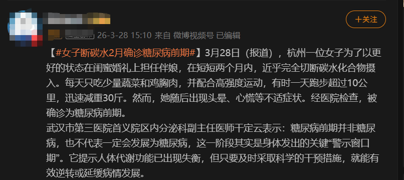 - - 阅 15最近,一则关于“杭州26岁女子断碳水2个月暴瘦30斤,结果确诊糖尿病前期”的新闻在网络上闹得沸沸扬扬。