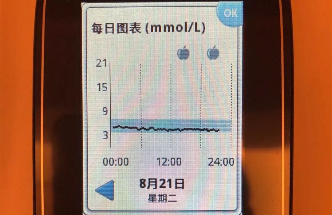 从照片中可以看到,我日常全天血糖平淡如水平面,稳如死狗,无论餐前还是餐后(苹果图标表示吃饭),血糖几乎没有波动。