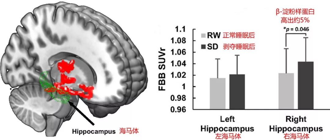 研究者发现,一晚不睡觉脑内β-淀粉样蛋白增加5%,并聚集在右海马体(海马体掌管短时记忆)。而阿尔兹海默病患只比正常人高45%。⑦