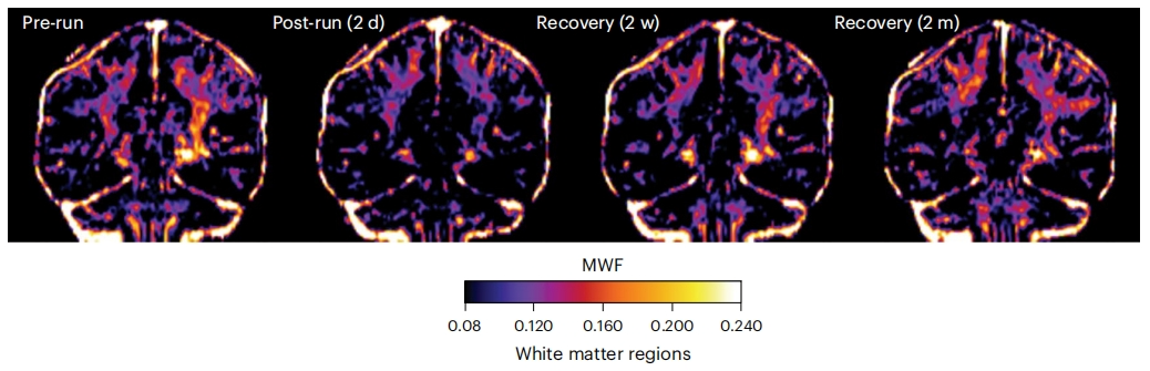 研究人员通过3T磁共振(MRI)扫描发现,全马跑者在赛后1-2天,大脑多个区域的“髓鞘水分数”(MWF)显著下降,部分区域降幅高达28%。