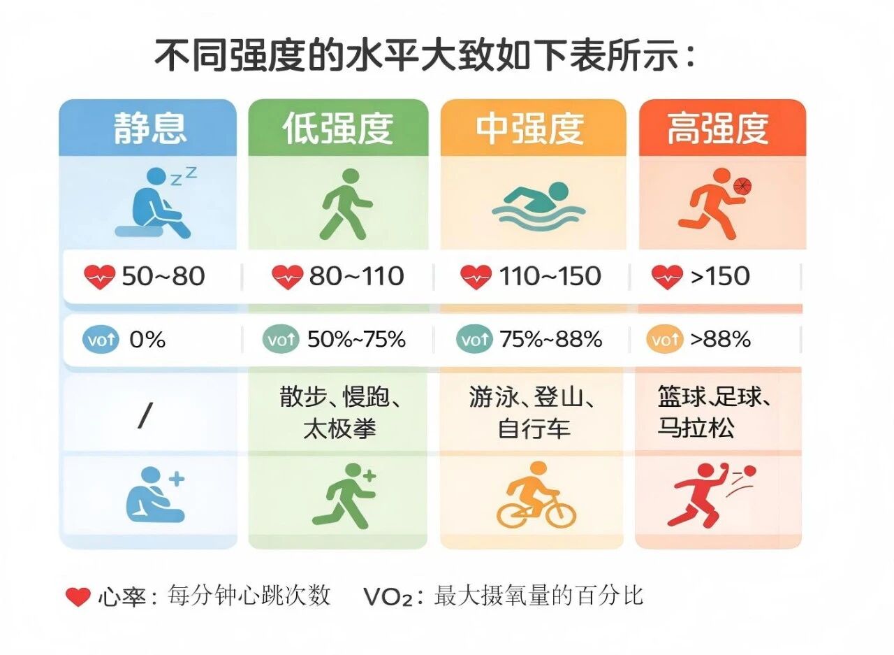 简单来说,运动强度就是指运动过程中,单位时间内身体消耗了多少能量。在科学研究中,常使用心率(HR)和最大摄氧量(VO2 max)来描述运动的强弱,并据此将运动项目分类。