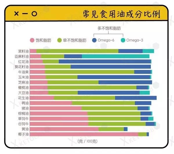椰子油(排名第一),橄榄油,黄油,牛油果,鱼油,猪油等动物油,棕榈油,亚麻籽油,